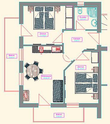 ca. 55 m², für 2 - 4 Personen, im 1. Stock mit 2 Schlafzimmer und 2 Balkone